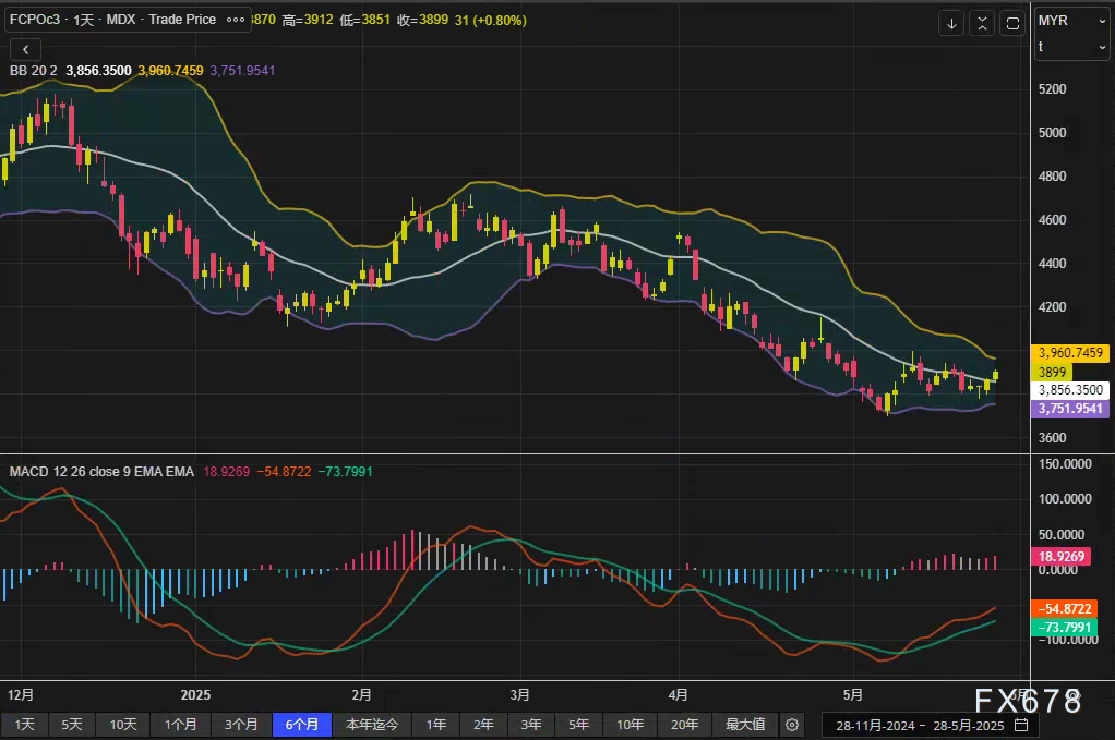周三(5月28日),马来西亚衍生品交易所(BMD)基准8月棕榈油合约(FCPOc3)收报3899林吉特/吨,日内上涨31林吉特(0.8%),实现四连阳。短期空头回补与大连植物油走强共同推动价格反弹,但技术指标显示市场仍处调整周期,后续动能需观察原油及外围油脂市场联动。