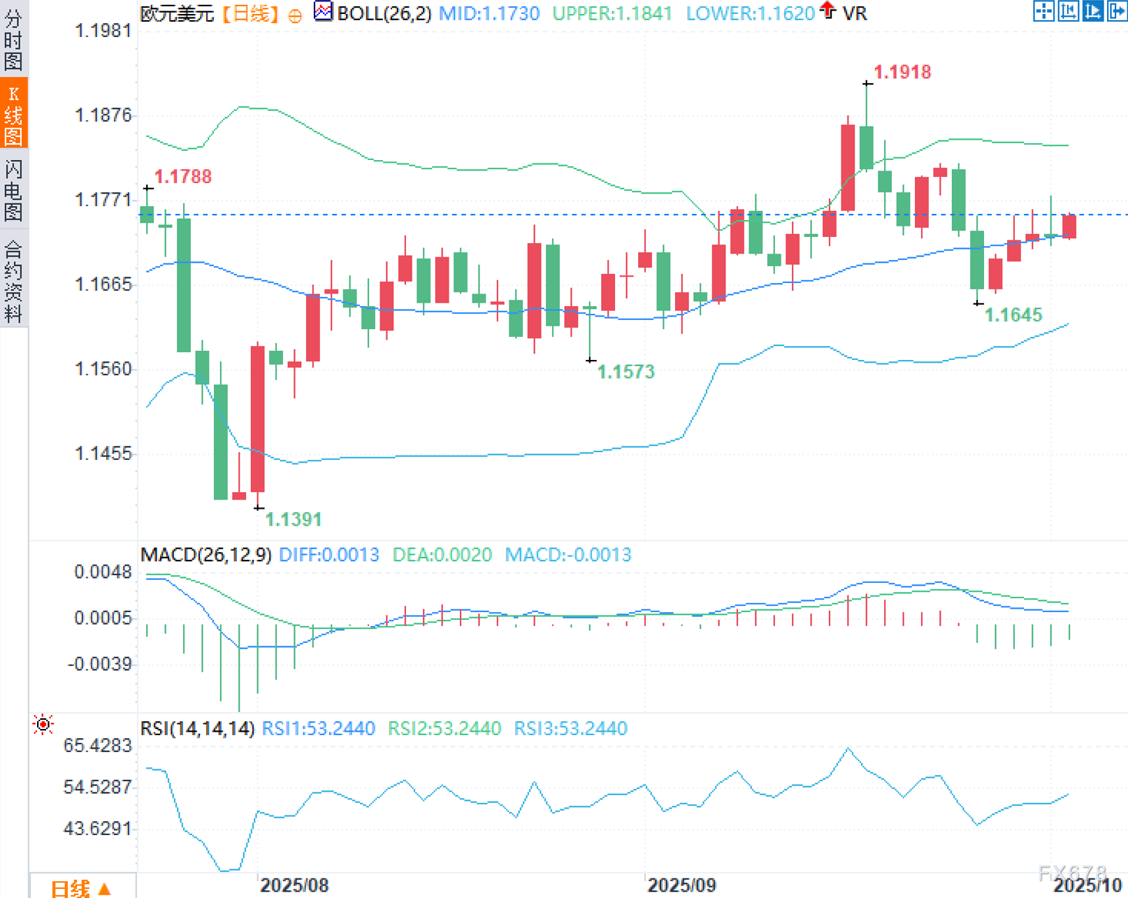 基本面 第一,欧洲服务业景气边修边稳:意大利与西班牙服务业活动超预期,德国略低于预期,法国收缩加速,但HCOB服务业PMI汇总仍处扩张的51.3(此前估计为51.4),为1月以来的最强读数,指向三季度末经济韧性尚存。与此同时,欧元区8月失业率意外由6.2%升至6.3%,但对欧元影响温和,市场将其解读为“边际走弱但未破坏扩张”的组合。 第二,美国劳动力的“冷热错配”仍在:9月挑战者裁员人数从8月的85979降至54064,但年内招聘计划合计仅204939,为2009年以来最低,显示岗位供给端谨慎与需求端降温并存——这与近期就业分项走软相呼应。 第三,美联储口径分化强化“十月不确定性”:达拉斯联储主席Lorie Logan支持9月25bp降息,但明确对过快降息保持警惕,并不急于在下次会议继续降息。与之相对,部分利率市场仍押注年内10月与12月再降两次,这种“官方偏谨慎—市场偏鸽派”的错位,使美元短线时强时弱,汇价缺乏单边趋势的燃料。 第四,数据真空与情绪牵动:因美政府停摆,月初重磅的非农等数据面临延迟发布,FOMC官员讲话取代宏观数据成为本周主导变量。权衡之下,美元周四自一周低位反弹,一度带动黄金自3900美元附近回落至3820美元区域。 技术面: 日线图显示,布林带中轨位于1.1731,汇价当前围绕中轨略上方/附近震荡,布林带口径并未显著张开,属“带宽收敛后的平衡—等待方向选择”的典型状态;上轨1.1840、下轨1.1622构成短线动态阻力与支撑。价格区间内可见前高1.1769与近期波段高点1.1918两道上方压力;下方除1.1685外,近端低点1.1645更具参照意义。